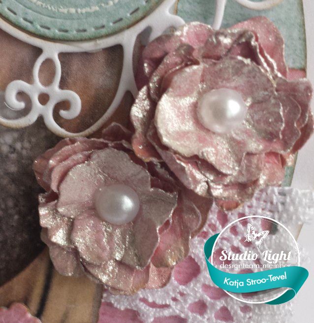 Bloemen Noor!Design 6003/0066 en deze heb ik bewerkt met glitterspray en Watercolour Medium Iridescent waar ze een parelmoer laagje van krijgen. (zie foto hieronder)
