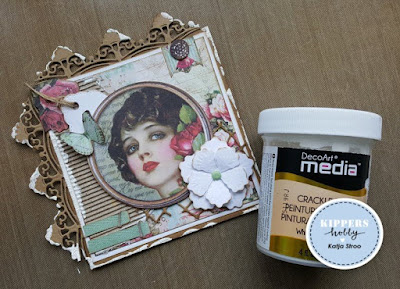 De randjes heb ik bewerkt met bruine inkt en daarna ingesmeerd met Crackle Paint van DecoArt. Als je dit goedje op laat drogen 'breekt' het en krijg je dus een crackle effect.