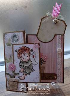 De bloempotjes zijn Laser Art 472.948.019 de bloemetjes zijn ook met Copic Markers gekleurd en het potje heb ik bewerkt met Distress Ink Walnut Stain. Het vlindertje is ook uit een Laser Art set 472.948.007 De tekst binnenin is uit de set Dutch Label Art 474.007.002.